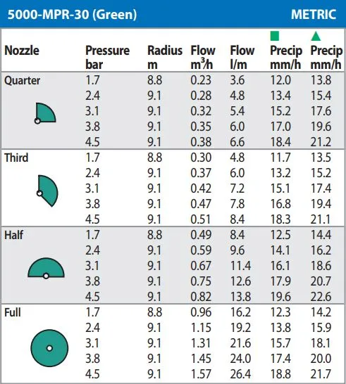 De Rainbird 5000 MPR set groen bevat sproeikoppen die de intensiteit van de neerslag stabiel houdt. Over- en onderberegening is verleden tijd. Hiermee wordt het ontwerp- en installatieproces van de Rainbird 5000 plus modellen zeer gemakkelijk. Iedere set bestaat uit 4 nozzles bedoeld voor 4 verschillende hoeken (90º - 120º - 180º - 360º). De set is leverbaar in drie verschillende kleuren die refereren naar een specifieke sproeibereik.
