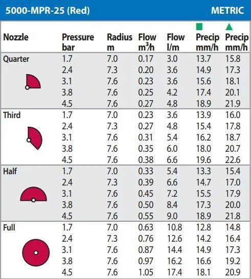 De Rainbird 5000 MPR set rood bevat sproeikoppen die de intensiteit van de neerslag stabiel houdt. Over- en onderberegening is verleden tijd. Hiermee wordt het ontwerp- en installatieproces van de Rainbird 5000 plus modellen zeer gemakkelijk. Iedere set bestaat uit 4 nozzles bedoeld voor 4 verschillende hoeken (90 º - 120 º - 180 º - 360 º). De set is leverbaar in drie verschillende kleuren die refereren naar een specifieke sproeibereik.