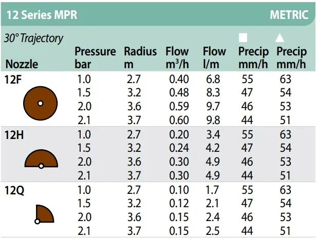 De Rainbird nozzle MPR-12F bruin is geschikt voor montage op de Rainbird 1800 pop-up sproeier serie. Deze nozzle heeft een vaste sproeihoek van 360° en is hierbij een half-circle nozzle. Bij de nozzle wordt er een filterzeef geleverd die verstopping voorkomt en zorgt voor een nauwkeurige afstelling van de straal.