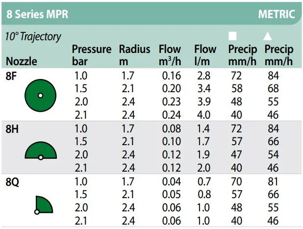 De Rainbird nozzle MPR-8H groen is geschikt voor montage op de Rainbird 1800 pop-up sproeier serie. Deze nozzle heeft een vaste sproeihoek van 180° en is hierbij een half-circle nozzle. Bij de nozzle wordt er een filterzeef geleverd die verstopping voorkomt en zorgt voor een nauwkeurige afstelling van de straal.