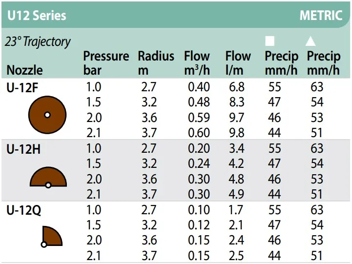De Rainbird nozzle U-12F bruin is geschikt voor montage op de Rainbird 1800 pop-up sproeier serie. Deze nozzle heeft een vaste sproeihoek van 360° en is hierbij een full-circle nozzle. Verder heeft de nozzle een extra opening voor besproeiing van dichtbij. Hiermee worden droge, bruine plekken rond de sproeikop geminimaliseerd.