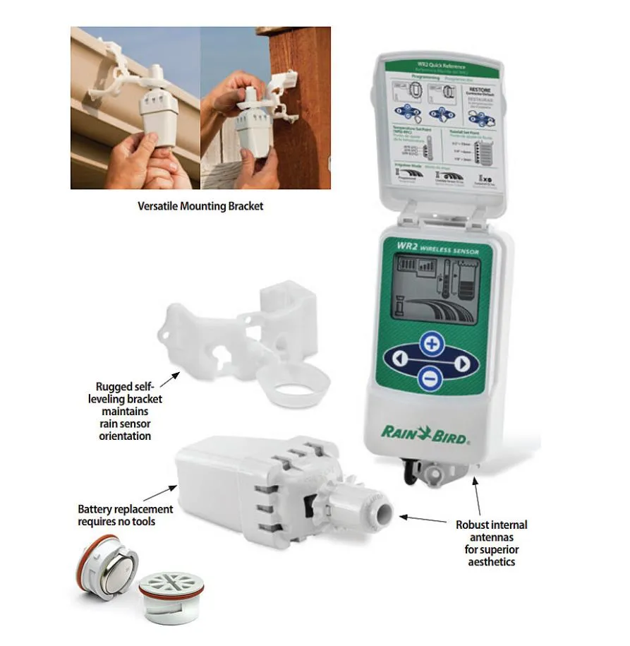 De Rainbird WR2-RFC draadloze regen/vorstsensor onderbreekt automatisch het beregeningssysteem bij regenval of vorst, waardoor overbewatering en vorstschade wordt voorkomen. Het meetpunt voor de neerslaghoeveelheid is instelbaar tussen de 3 en 19 mm. De temperatuur is als meetpunt instelbaar tussen 0,5 °C en 5 °C.