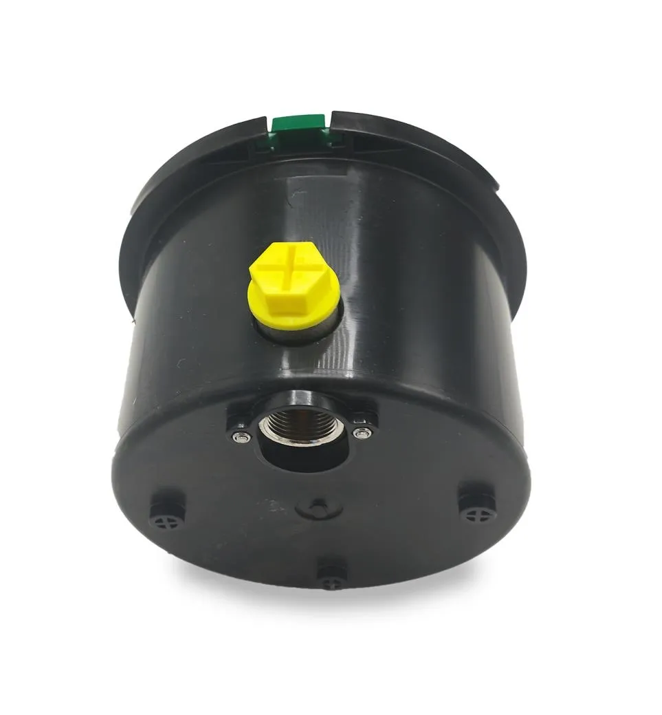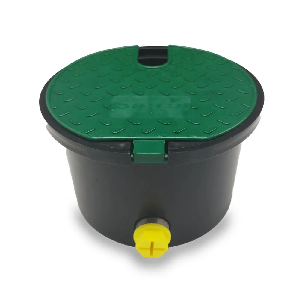 Ronde kleppendoos met kraantje. De kraan beschikt over een 3/4" buitendraad verbinding aan de achterzijde en een 3/4" binnendraad verbinding aan de onderzijde.