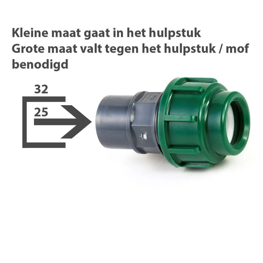 De kleinste PVC maat gaat in het hulpstuk / de grootste PVC maat valt tegen het hulpstuk. Een mof / sok is dan benodigd.