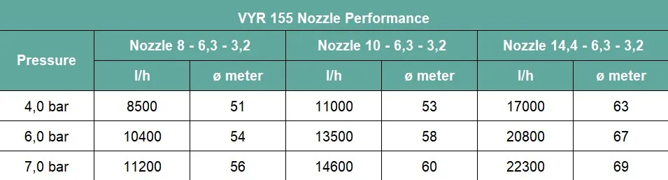 De VYR 155 rondgaande kanonsproeier | 1 1/4" buitendraad is uitermate geschikt voor grotere oppervlaktes als weilanden, landbouw en sportvelden. De sproeier wordt standaard geleverd met 3 nozzles (10 mm / 6,3 mm / 3,2 mm). Deze kanonsproeier heeft een bereik van 51 tot 69 meter (diameter).