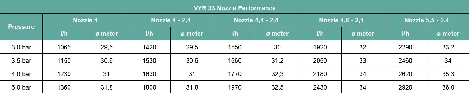 VYR 33 rondgaande nachtvorstsproeier. De sproeier heeft aan de onderzijde een 3/4" binnendraad aansluiting. De VYR 33 is een rondsproeier en kan daarom alleen volledig rond beregenen en is dus niet instelbaar. De sproeier is voorzien van een 4,0 x blind nozzle.