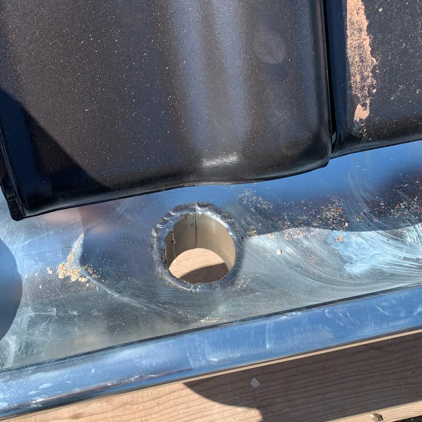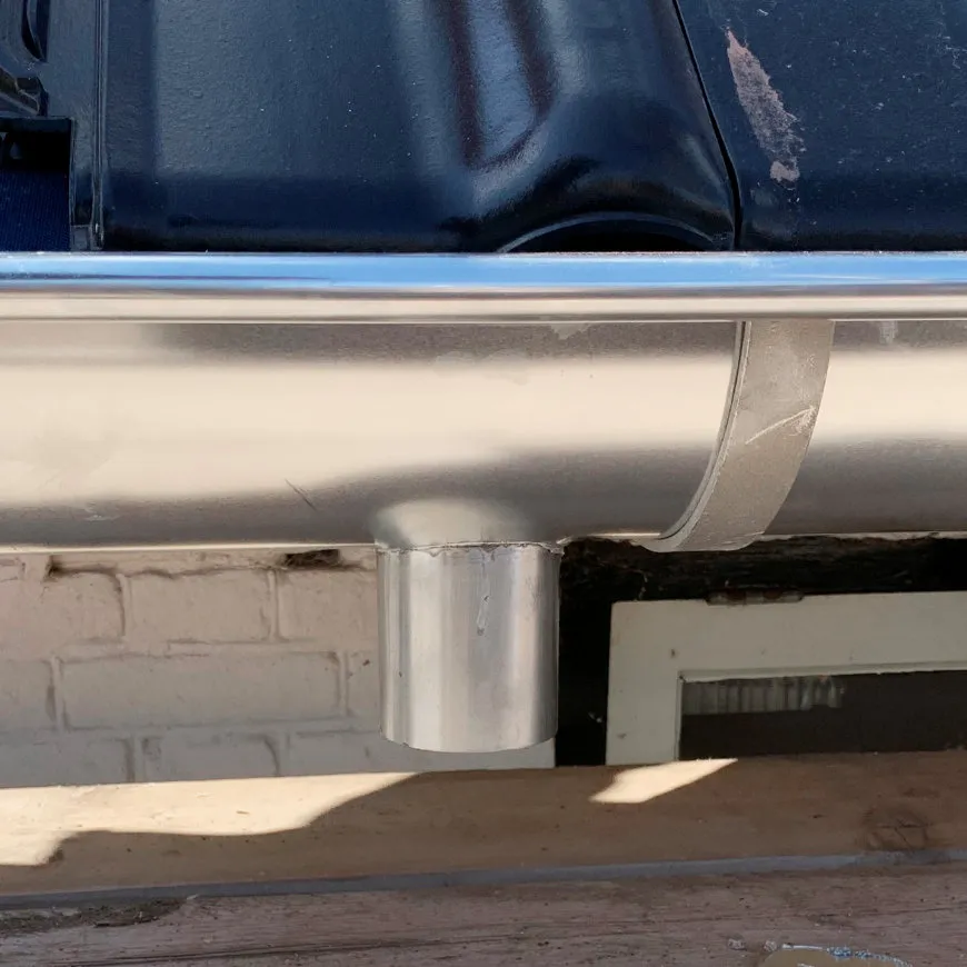 Boor een gat in de mastgoot, dit gat moet een doorsnee hebben van 60 diameter. Laat het tapeind door het gat zakken tot de opstaande rand op de mastgoot rust. Soldeer vervolgens de opstaande rand vast in de mastgoot. Bevestig vervolgens de regenpijpen aan de onderzijde.